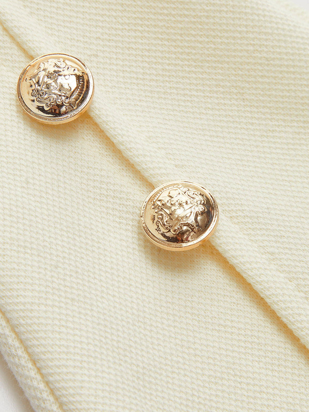 Knit sweater featuring a straight neckline and balloon sleeves. The sleeves end with cuffs detailed by gold buttons. The waist area includes a cinched panel that narrows the silhouette. The material is a mid-weight knit blend with structured yet flexible properties. The fit is shaped at the waist with volume through the sleeves. The sweater is designed for pull-on wear with stretch and contains no additional closures. No other decorative elements are present.