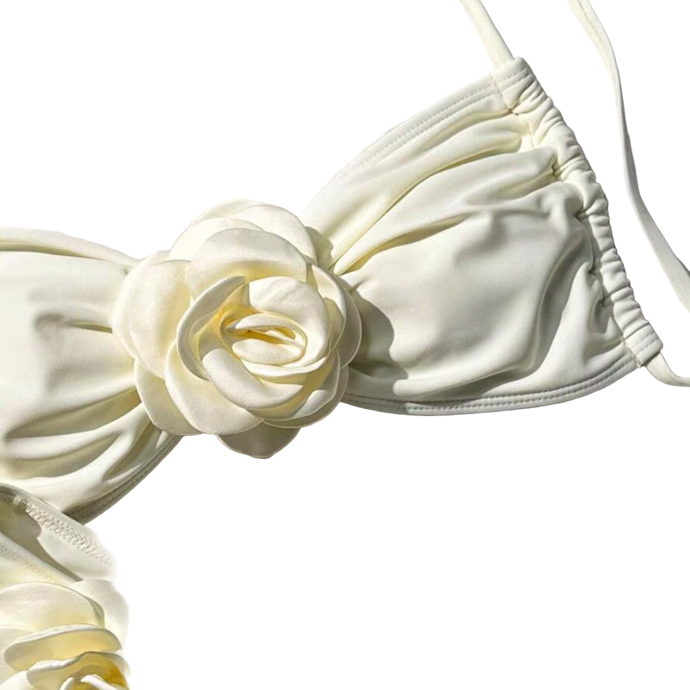 Two-piece bikini set consisting of a supportive bikini top and mid-rise bottoms. The top is secured with a back clasp closure. The bottoms have a pull-on design and provide moderate coverage. Floral appliqués are attached to the surface as decorative elements. Both pieces are made from a nylon-spandex blend with stretch and share the same floral embellishment style for a coordinated appearance.