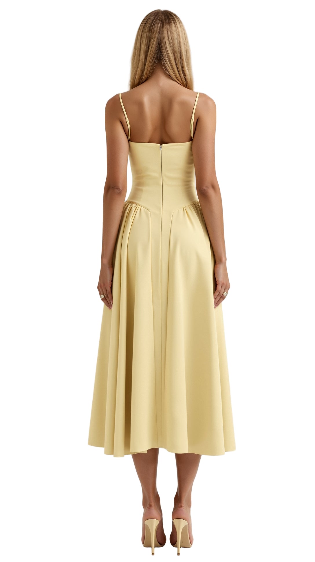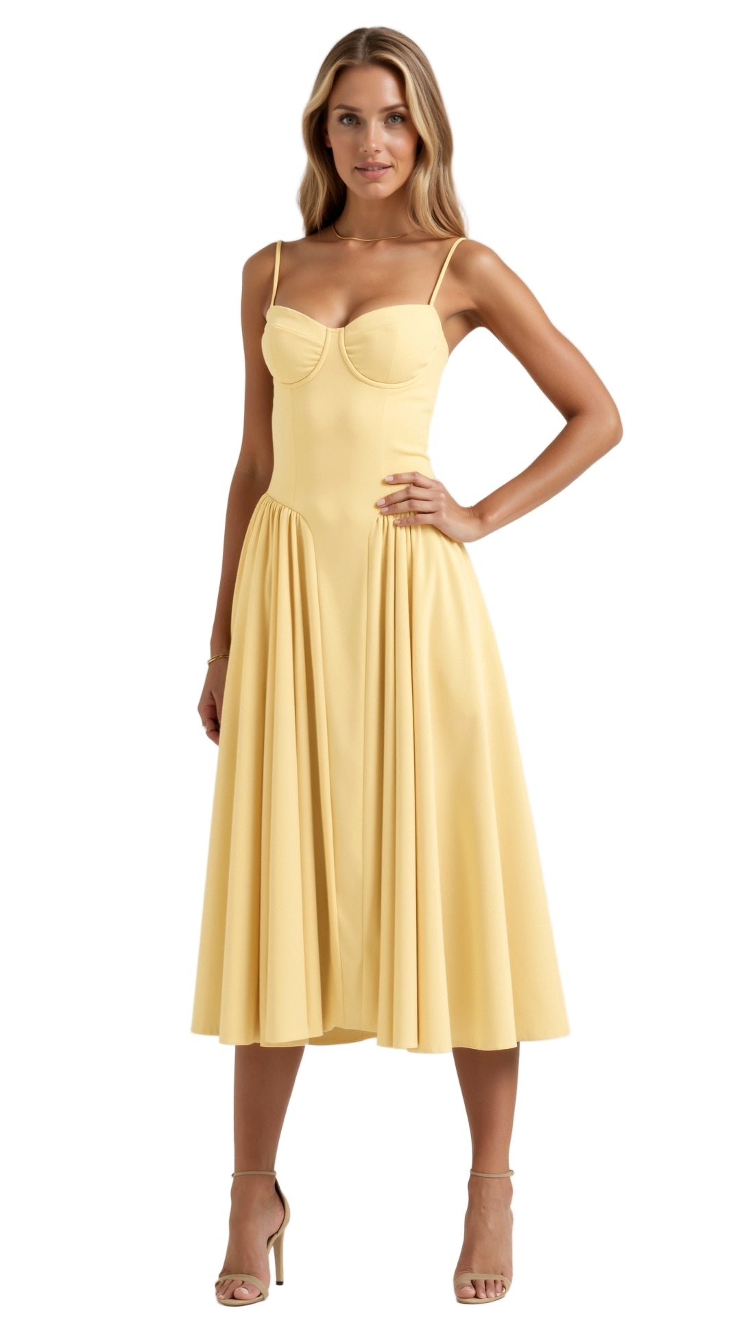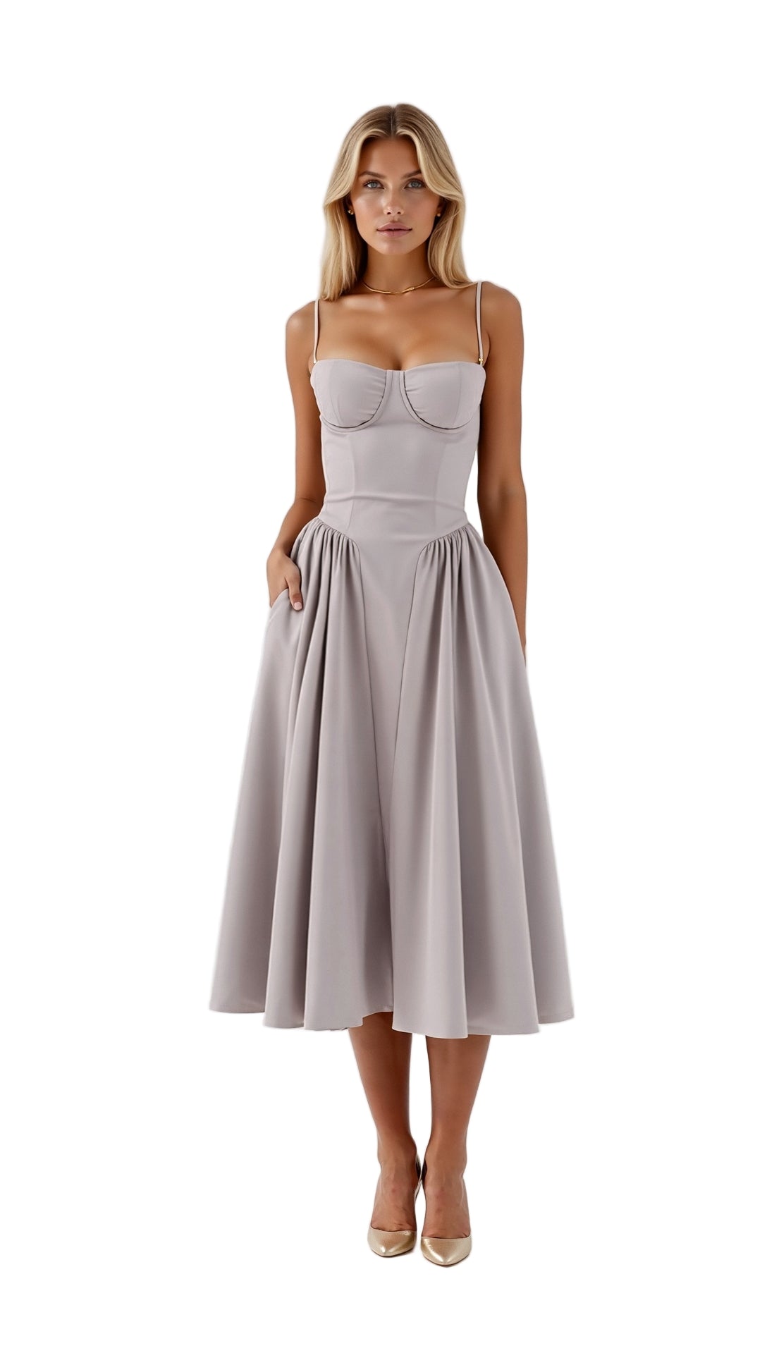 The dress features a bustier-inspired bodice with structured seams and defined cups. Adjustable thin straps attach at the shoulders. The skirt has a gathered, full silhouette extending to midi length. The material is a medium-weight woven blend that maintains its shape. A hidden zipper closure is located at the back. Seams are present along the bust, waist, sides, and skirt panels.