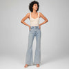 These jeans for women comprise a high-rise waistband with a flared leg shape.