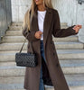 This coat has a longline silhouette with double-breasted closure and notched lapels.